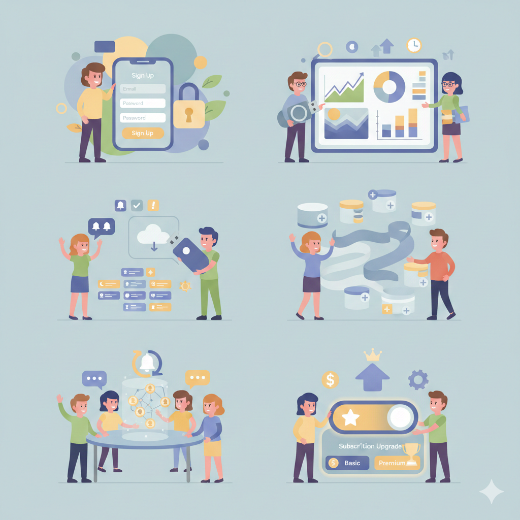 Contoh prompt : Create 6 consistent-style illustrations for a website onboarding flow. Style: flat minimal, soft color palette, rounded shapes. Themes: sign up, dashboard analytics, data import, notifications, collaboration, subscription upgrade.
