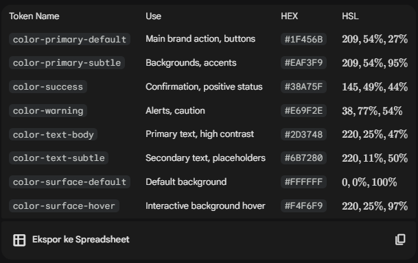 Contoh Prompt : Generate a minimal design system with tokens for color, spacing, typography, and shadows. The brand personality is ‘calm, trustworthy, modern’. Provide HEX, HSL, and token names. Then propose 5 reusable components that match the system.